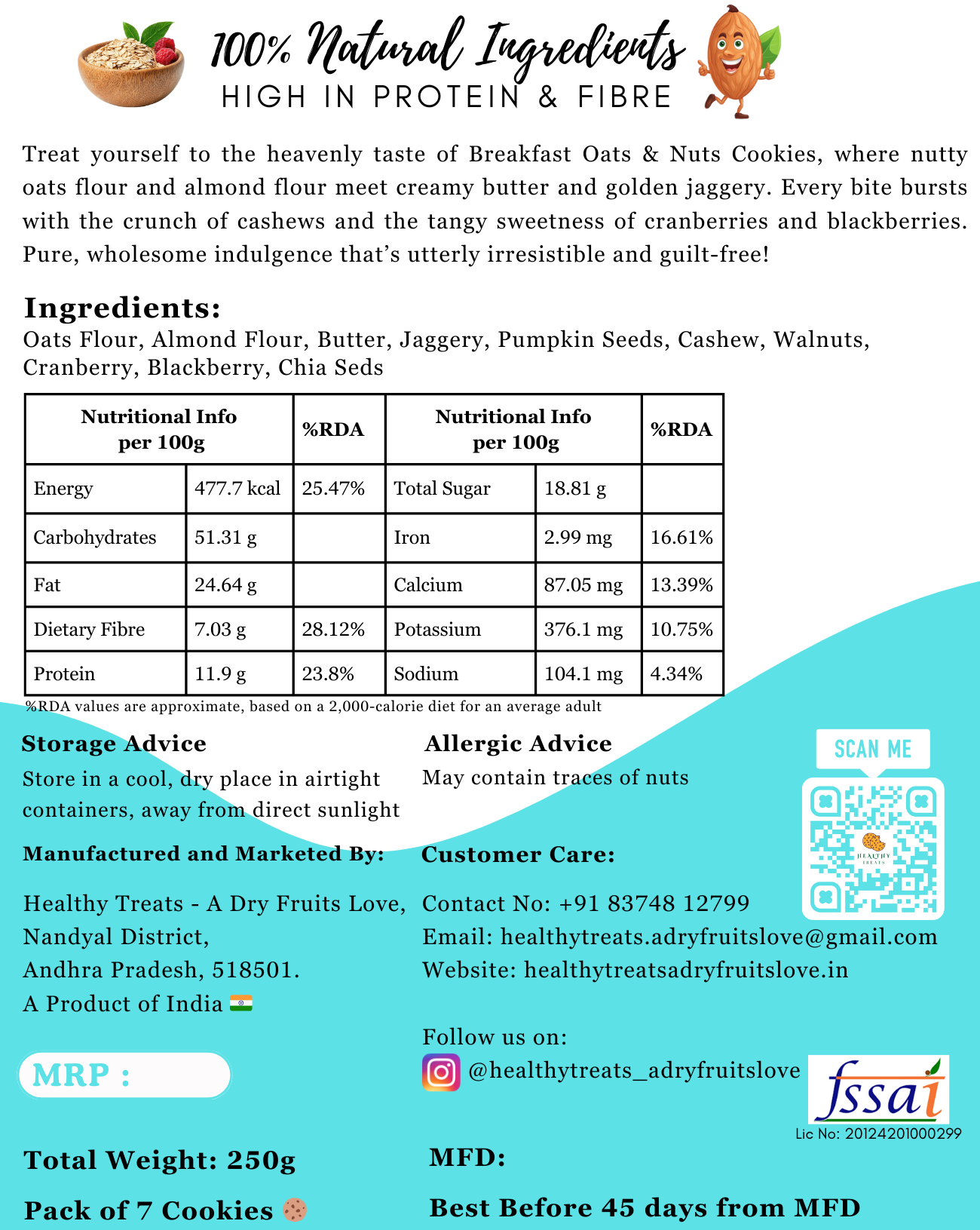 Treat yourself to the heavenly taste of Oats & Nuts Cookies, where nutty oats flour and almond flour meet creamy butter and golden jaggery. Every bite bursts with the crunch of cashews and the tangy sweetness of cranberries and blackberries. Pure, wholesome indulgence that’s utterly irresistible and guilt-free!
