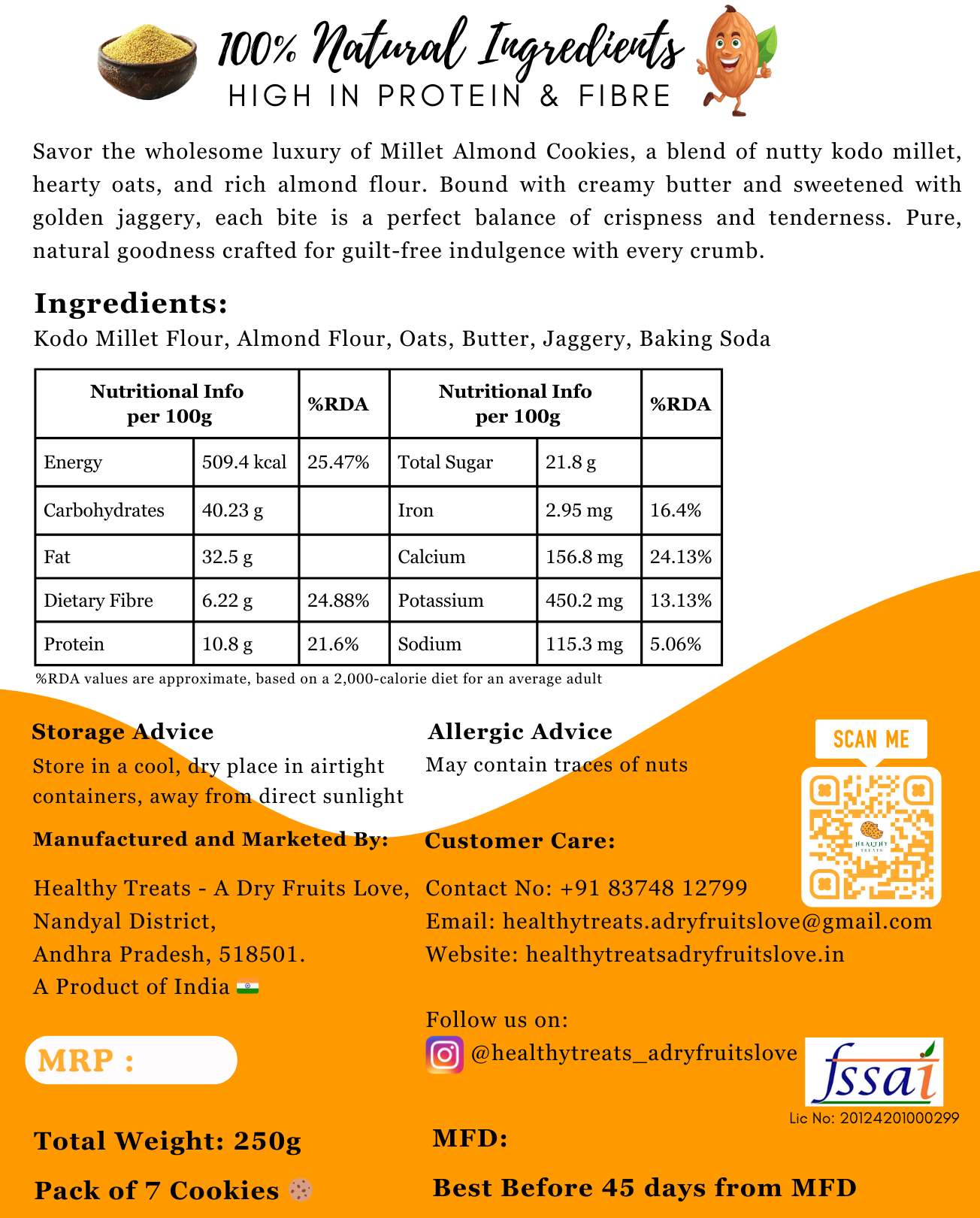 Savor the wholesome luxury of Millet Almond Cookies, a blend of nutty kodo millet, hearty oats, and rich almond flour. Bound with creamy butter and sweetened with golden jaggery, each bite is a perfect balance of crispness and tenderness. Pure, natural goodness crafted for guilt-free indulgence with every crumb.