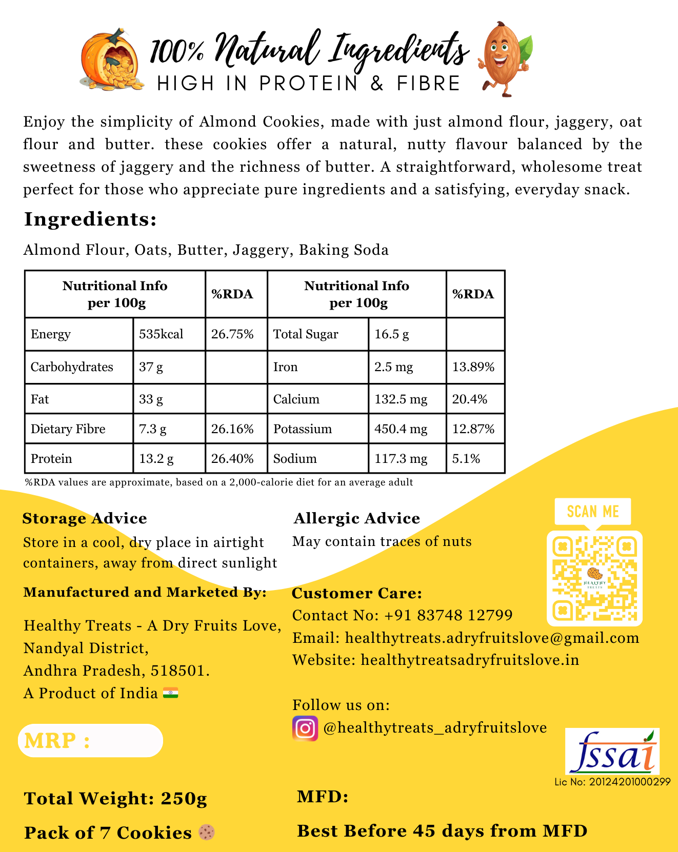 Enjoy the simplicity of Almond Cookies, made with just almond flour, jaggery, and butter. These cookies offer a natural, nutty flavour balanced by the sweetness of jaggery and the richness of butter. A straightforward, wholesome treat perfect for those who appreciate pure ingredients and a satisfying, everyday snack.